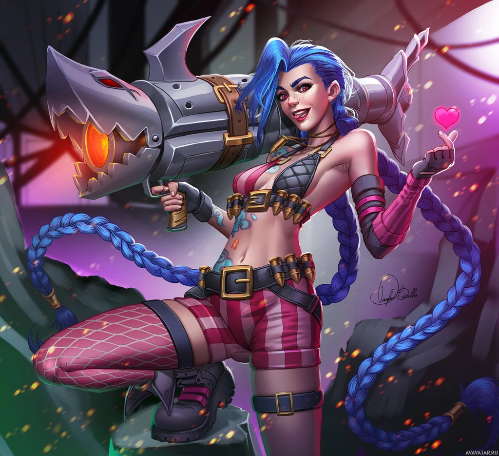 an animated character resembling Jinx from the game "League of Legends." She is depicted with her signature