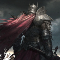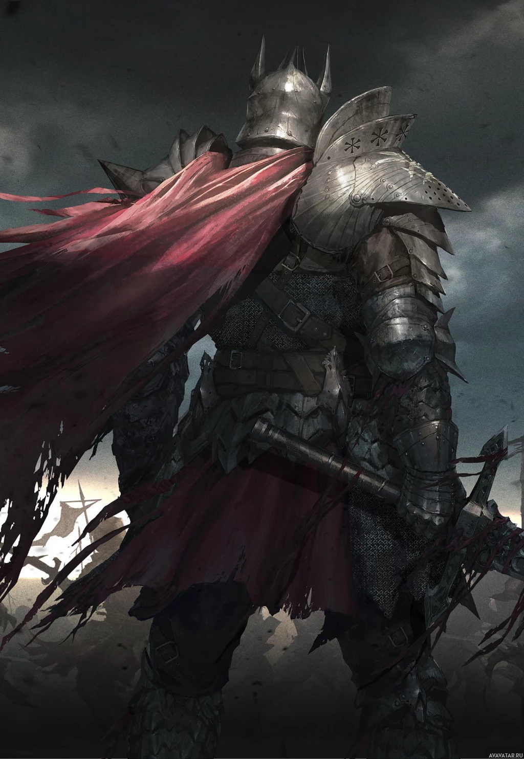 dark clouds looming above and what looks like bloodstains on the ground. The overall atmosphere of the image conveys a sense of intensity and heroism typical of characters in fantasy narratives.