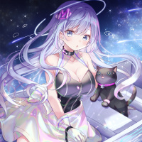 a black cat in her lap. The background suggests an outdoor night setting with stars visible above. The art style is reminiscent of Japanese anime illustrations.