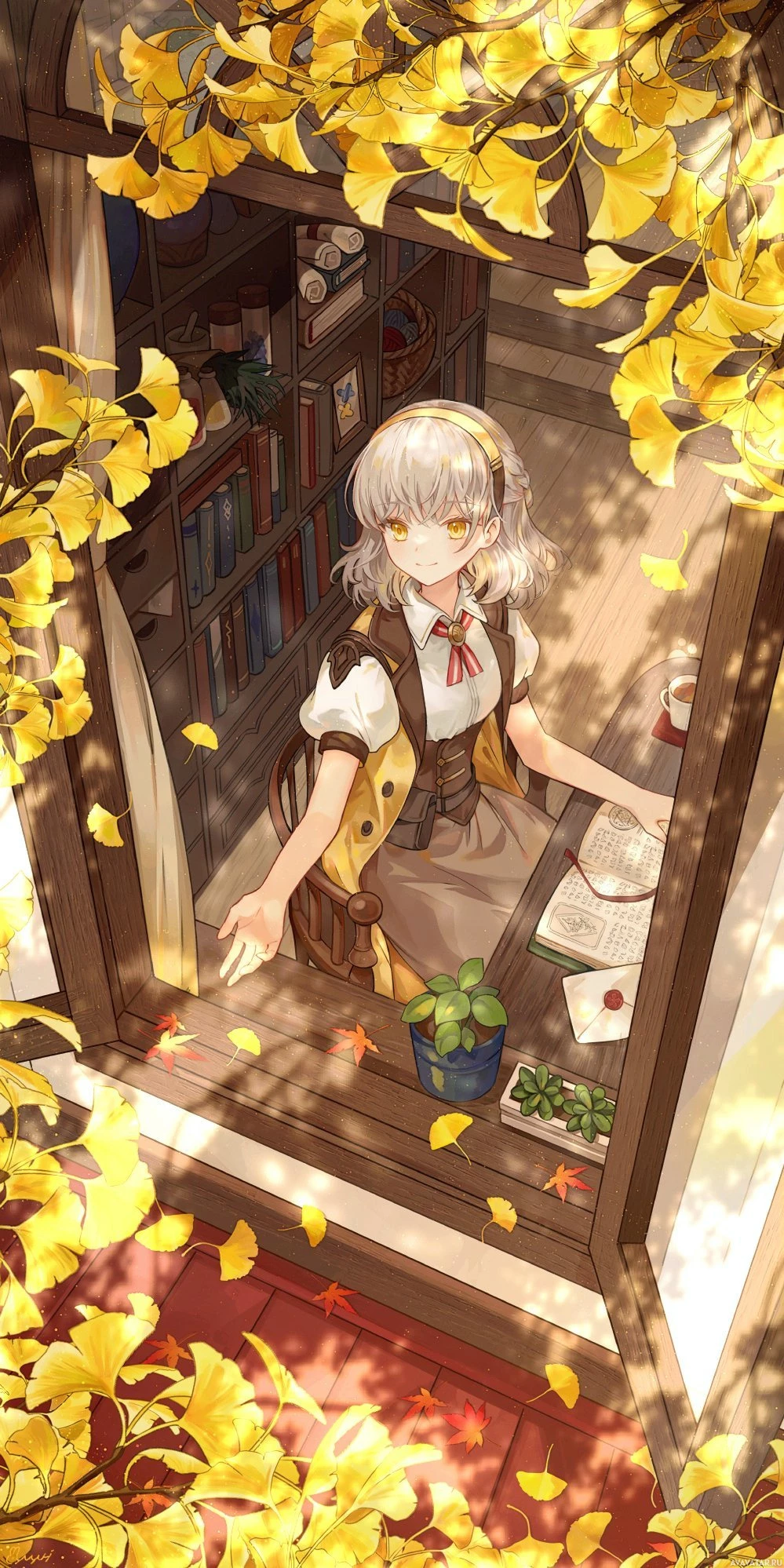 autumn leaves, suggesting it might be fall season. The girl is dressed in