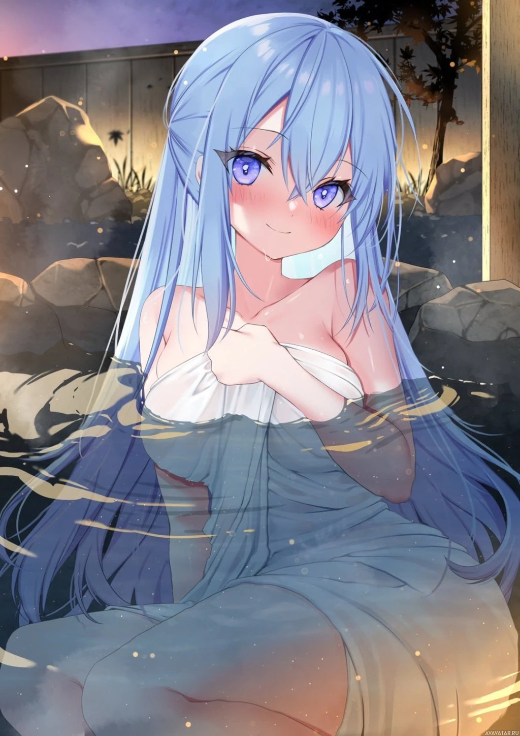 blue hair. She is depicted sitting in water up to her waist, holding what appears to be