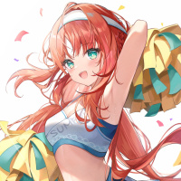The image features an anime-style illustration of a girl with red hair. She is depicted in a dynamic pose that suggests she is dancing or cheerleading, as indicated by the pom-poms she's holding. The background includes confetti, adding to the celebratory atmosphere suggested by her expression and the overall composition of the image.