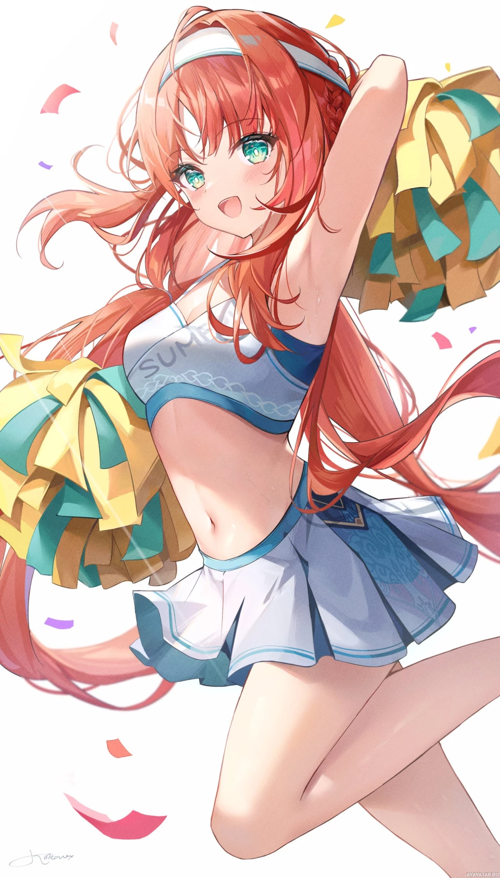 На картинке изображена девушка с рыжими волосами в стиле аниме. Она изображена в динамичной позе, которая наводит на мысль, что она танцует или ведет группу поддержки, о чем свидетельствуют помпоны, которые она держит в руках. Фон украшен конфетти, что создает праздничную атмосферу, создаваемую выражением ее лица и общей композицией образа.