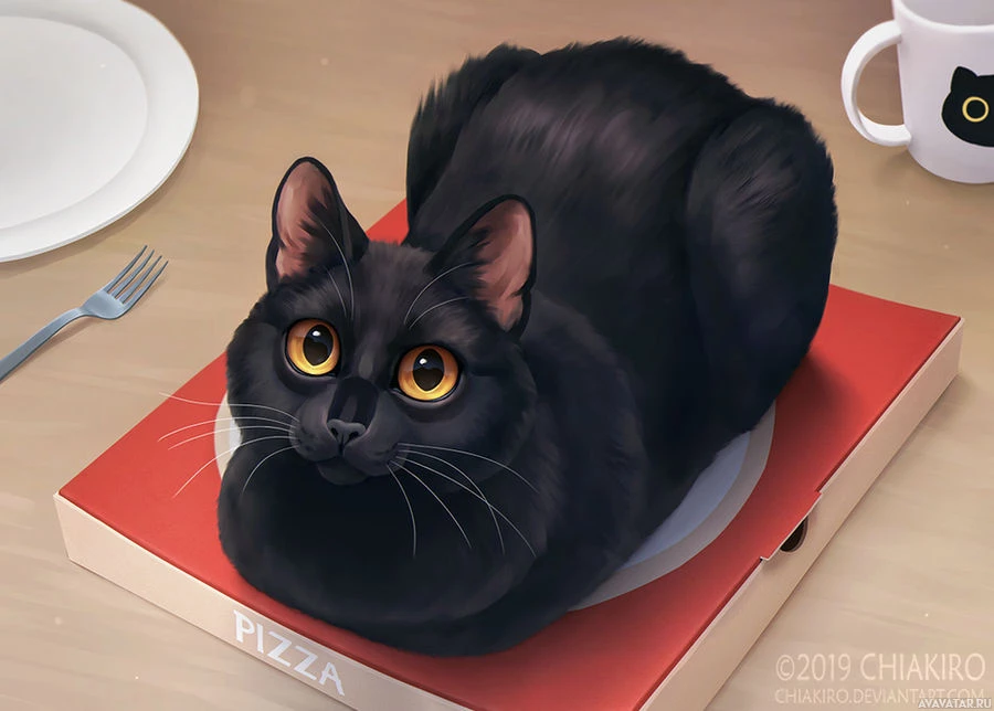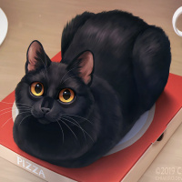 black cat sitting on a pizza box. The cat has