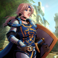 a female character who appears to be a warrior or knight. She is wearing armor and holding a shield, suggesting she might be from a game or story that involves combat and adventure in