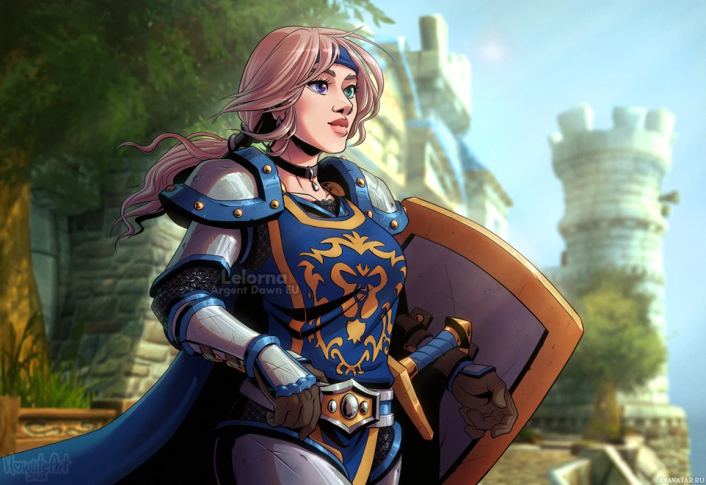 blonde hair and is standing confidently with her sword at her side, ready for battle. The background features what looks like a castle or fortress, adding to the medieval theme of the illustration.