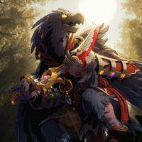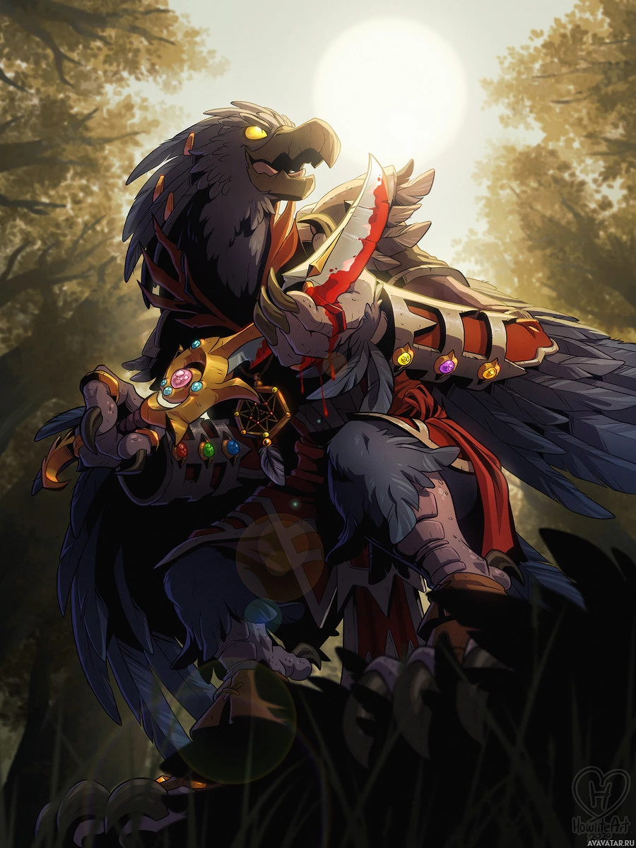 На картинке изображен персонаж из фэнтези, а именно птицеподобное существо, сидящее верхом на спине другого существа. Это существо украшено различными аксессуарами и, похоже, участвует в приключении или битве. Обстановка напоминает мистический лес, возможно, во время восхода солнца, учитывая условия освещения.