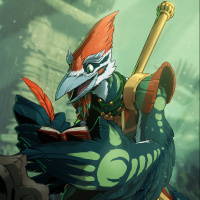 The image features a character who appears to be an anthropomorphic bird, possibly inspired by the design of mythical avian creatures from fantasy genres. This bird-like figure is standing upright and seems to be engaged in some sort of activity that involves reading or writing. The environment around it suggests a forest setting with misty conditions, which adds to the fantastical atmosphere of the image.