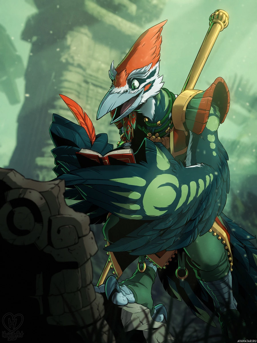 На картинке изображен персонаж, похожий на антропоморфную птицу, возможно, вдохновленный дизайном мифических птицеподобных существ из жанров фэнтези. Эта птицеподобная фигура стоит прямо и, похоже, занята каким-то занятием, связанным с чтением или письмом. Окружающая среда наводит на мысль о лесной обстановке с туманом, что придает изображению фантастическую атмосферу.