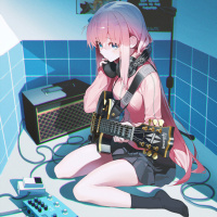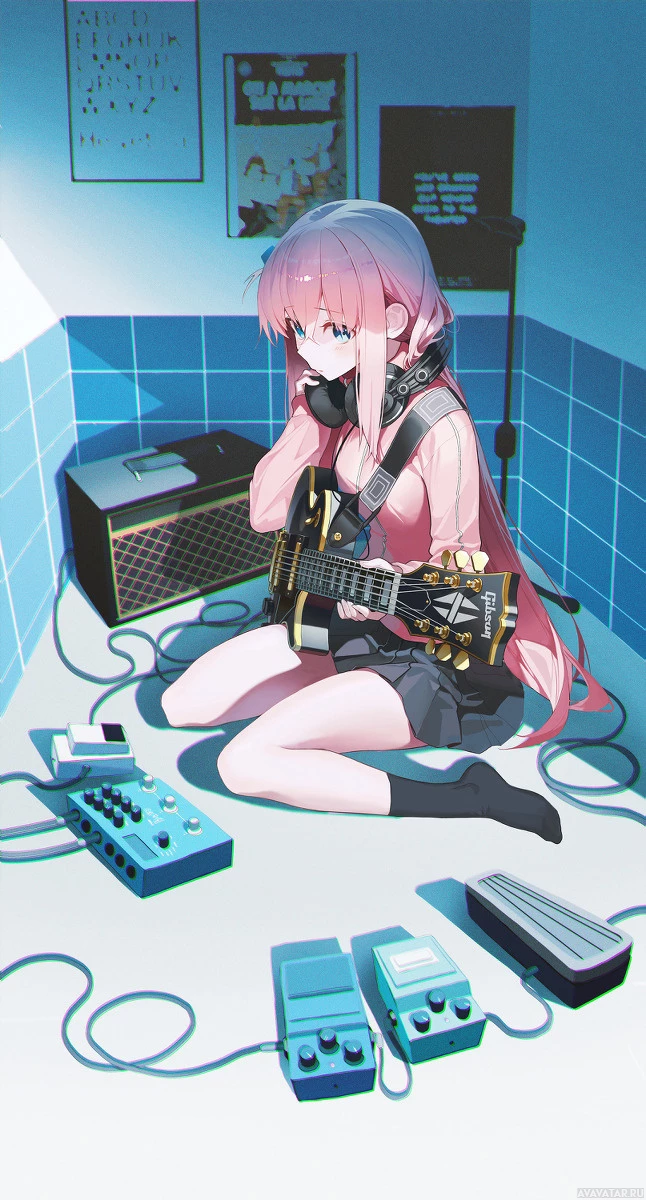 На картинке изображен анимационный персонаж с розовыми волосами, стоящий на коленях рядом с гитарой и другим музыкальным оборудованием. Кажется, что она увлечена игрой на гитаре или, возможно, выступлением. Обстановка позволяет предположить, что она находится в небольшой комнате, которая служит ее личной студией или местом для репетиций.