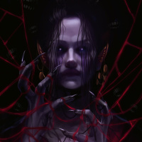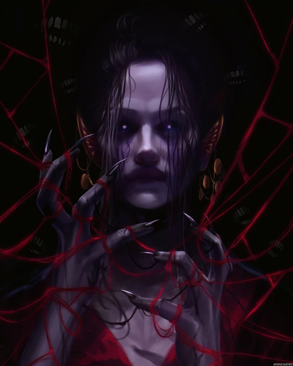 fantasy character that appears to be a drow, which is a fictional race of dwarves from the "Forgotten Realms" Dungeons & Dragons campaign setting. This creature has pointed ears and distinctive elongated facial features typical for drows in