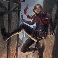 blonde hair, wearing what appears to be a costume that might be inspired by medieval or fantasy attire. She has a sword in her hand and is standing on what looks like a precarious ledge, possibly overlooking a cityscape. The setting suggests an adventure or action theme.