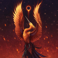 a prominent set of wings and is adorned with feathers that seem to be on fire. The background appears to depict