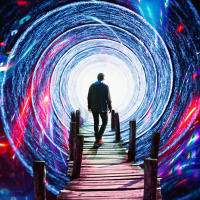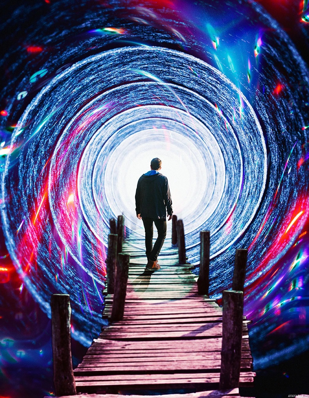 a contemplative state, gazing into the distance where there is an intriguing swirling tunnel or vortex with colorful, cosmic designs emanating from it. This could suggest that the image is digitally altered or created as an artistic representation rather than a real-