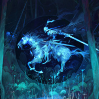 The image depicts a fantasy-themed artwork. It features a rider, possibly a warrior or knight, mounted on a horse in the center of a dark forest under