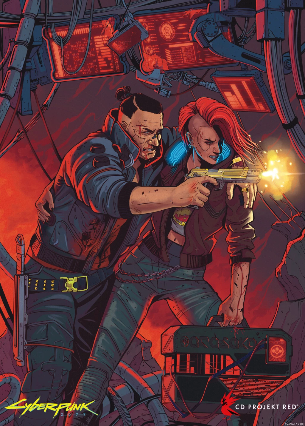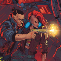 a futuristic setting, possibly inspired by the "Cyberpunk 2077" game. The characters are dressed in dark attire, with one of them wearing