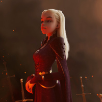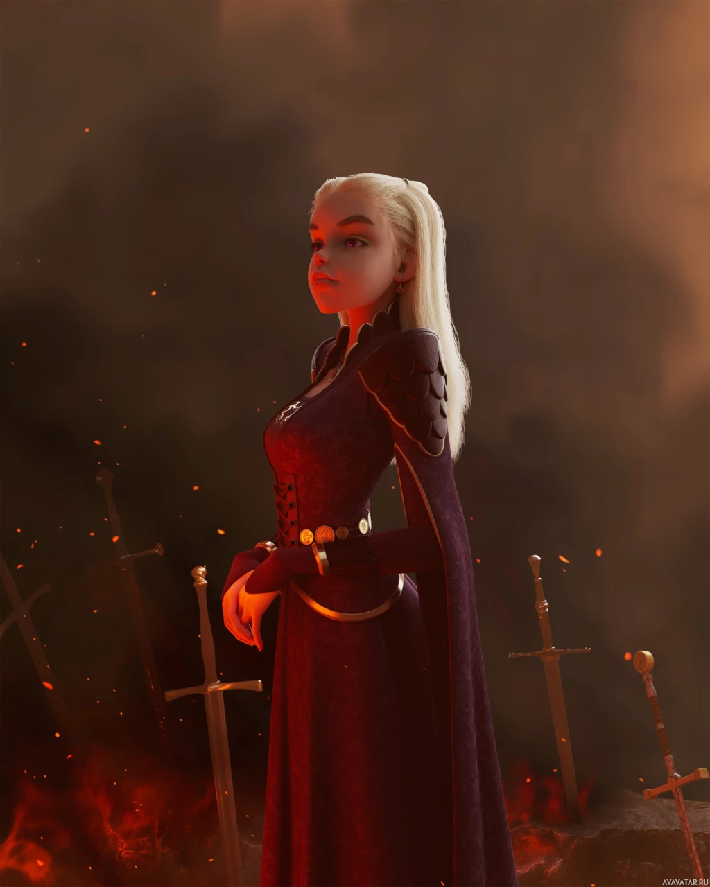 white hair, wearing a dress that has a medieval or fantasy design, with elements suggesting she might be part of a historical or fictional setting. In the background, there is