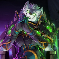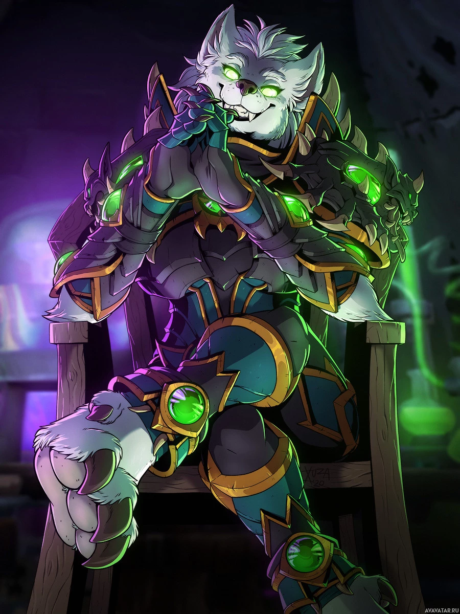 Это иллюстрация фантастического персонажа, изображенного в виде оборотня в доспехах. Персонаж имеет черты волка с горящими глазами и мускулистым телосложением. На нем надеты изысканные доспехи с замысловатыми узорами, что позволяет предположить, что он может быть воином или стражем в каком-то фантастическом окружении.