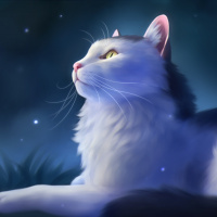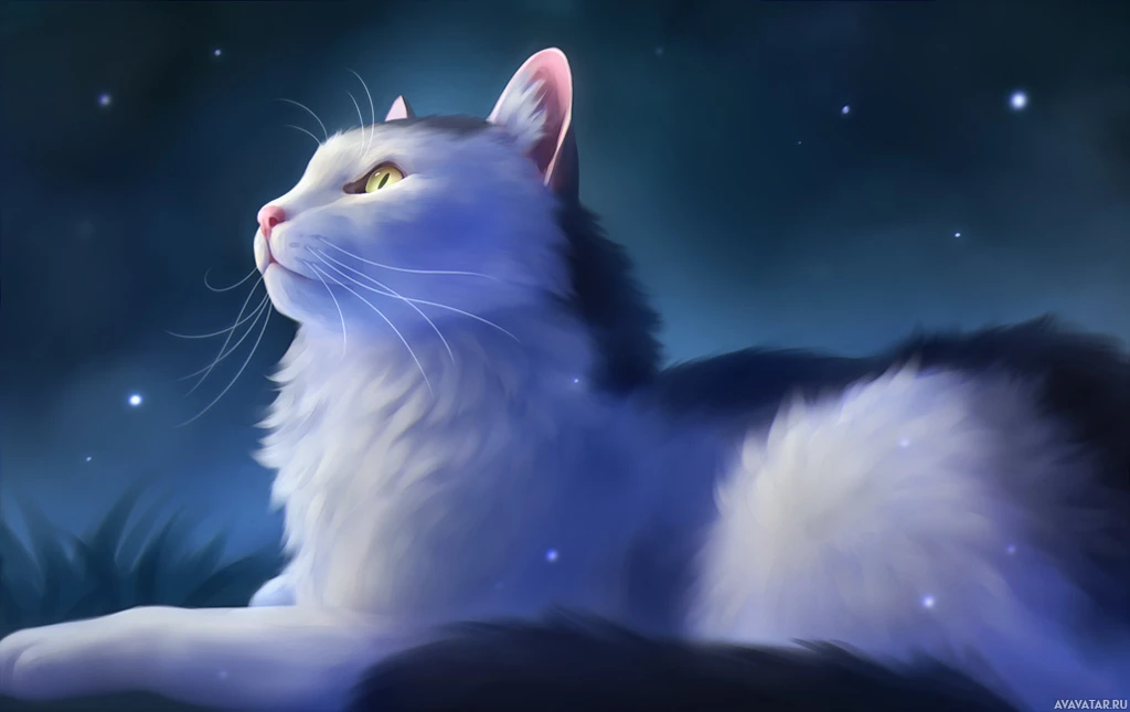 На картинке изображена кошка с белым пальто и более темными пятнами, сидящая ночью на открытом воздухе. Кошка смотрит вверх к небу, которое украшено мерцающими над ним звездами. Общее настроение образа спокойное и мирное.
