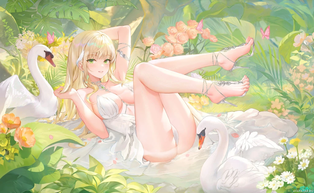 long hair. Her pose suggests relaxation or playfulness, as she stretches out with one hand behind her head. There are swans around her; some are on the ground, while others are floating in a nearby