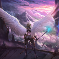 The image depicts a fantasy scene with an angelic figure prominently featured. This figure has wings, suggesting it is an angel or a creature of divine nature, and is standing in front of a mystical temple or fortress that appears to be floating amidst the clouds. The overall atmosphere is one of magic and otherworldly power.