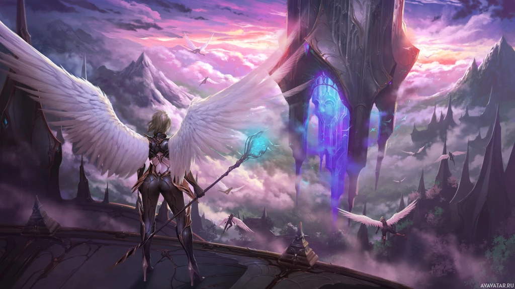 На картинке изображена фантастическая сцена, на которой отчетливо видна фигура ангела. У этой фигуры есть крылья, что указывает на то, что это ангел или существо божественной природы, и она стоит перед мистическим храмом или крепостью, которые, кажется, парят среди облаков. Общая атмосфера пропитана магией и потусторонней силой.