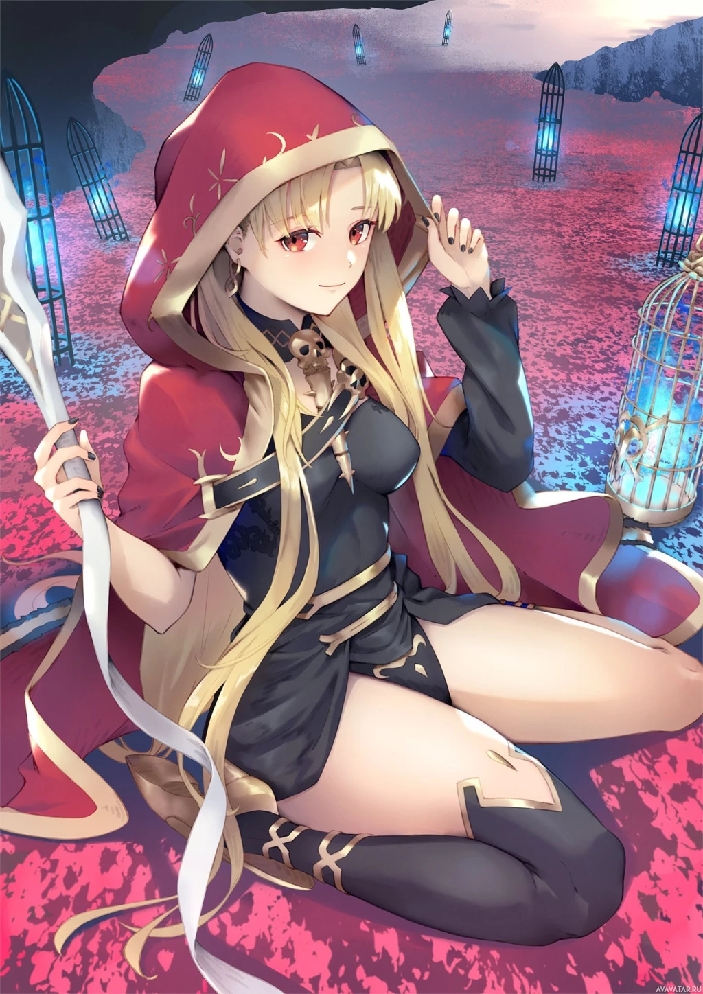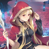 blonde hair and red eyes. She is wearing a red hooded cloak or cape over