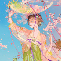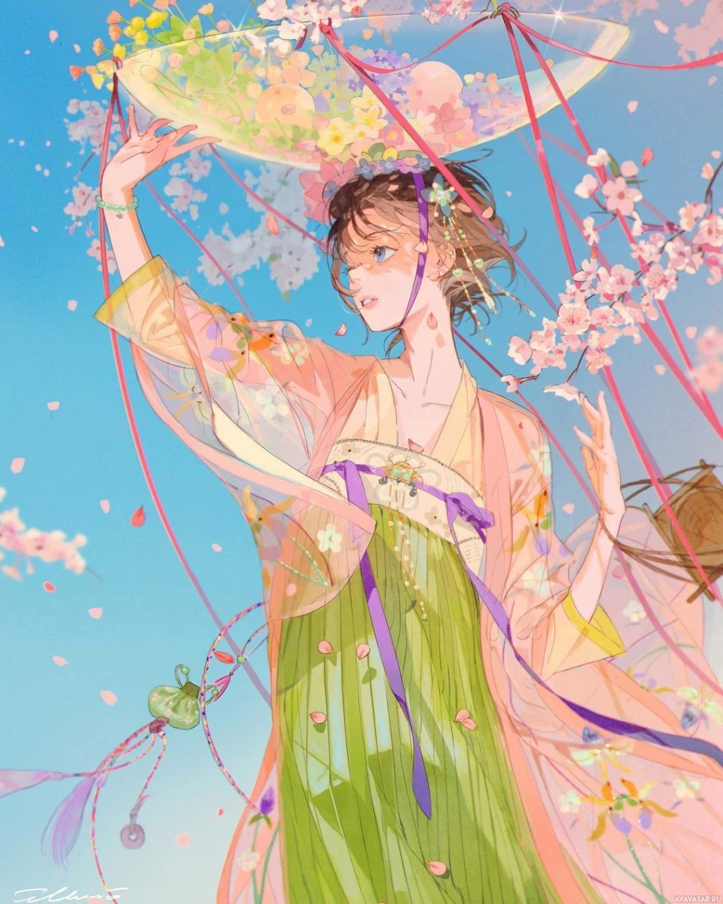 cherry blossoms falling like petals, suggesting it might be springtime. There's also an ethereal quality to the image, with delicate flower-like patterns floating around her and within her hair. The overall style is illustrative and stylized, reminiscent of Japanese anime or manga artwork.