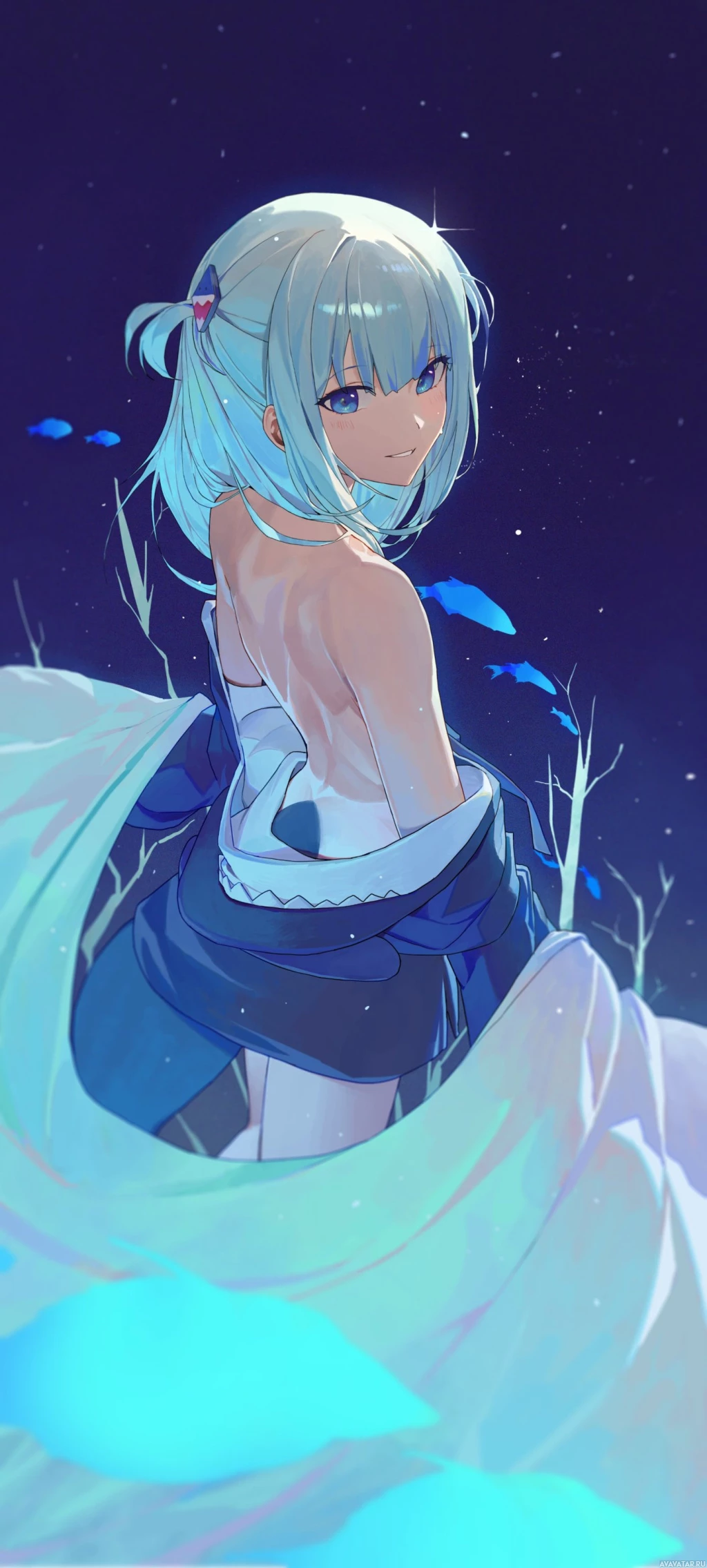 white hair and blue eyes. She is depicted from behind with