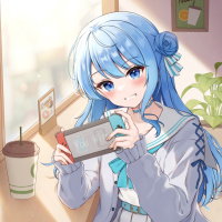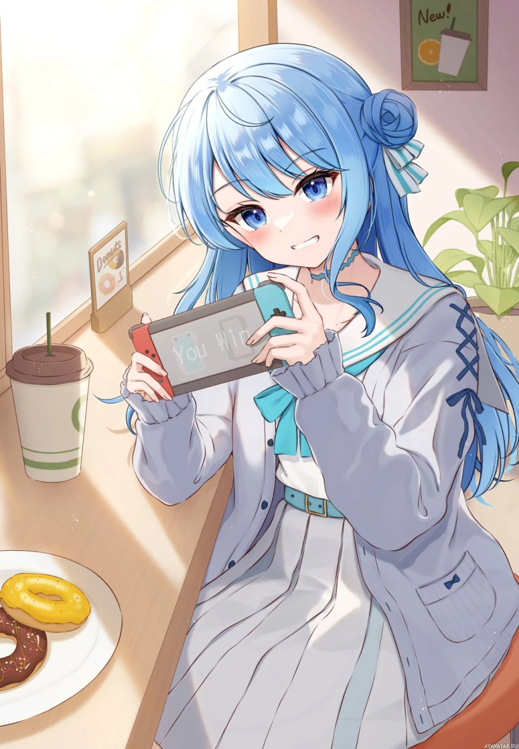 smiling expression. She's sitting at a table with what seems to be a plate of food in front of her and a drink cup, possibly enjoying a meal or snack while playing on a handheld