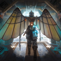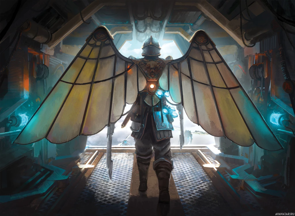 The image shows a character with wings standing inside what appears to be a futuristic or alien environment, possibly part of a spacecraft. The character is wearing armor and has intricate mechanical details on their back, which suggests they might be an android or some kind of robotic being with wing-like attachments. The setting is dimly lit and there are various