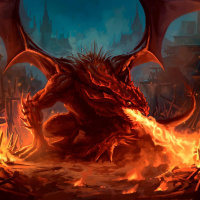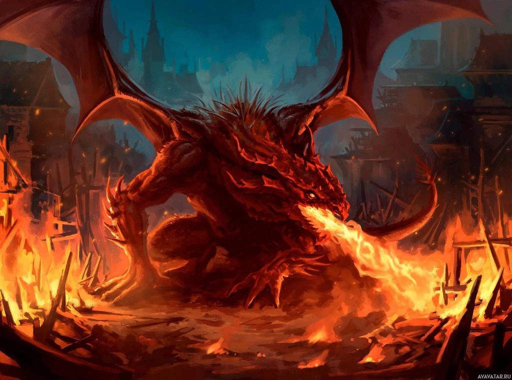 sharp teeth and claws. It appears to be standing amidst chaos; there are flames engulfing
