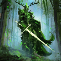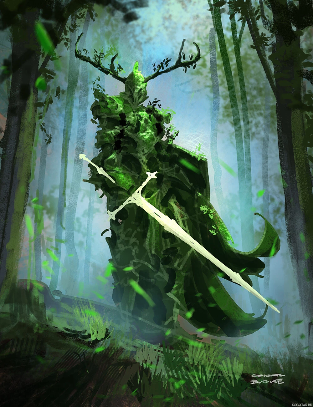 a fantasy storyline. The character's attire, including the cape and helmet adorned with antlers, adds to the mystical and otherworldly atmosphere. The forest is dense with trees and vegetation, creating an enchanting and mysterious environment. The sword held by the knight also reinforces the fantasy theme of the artwork.
