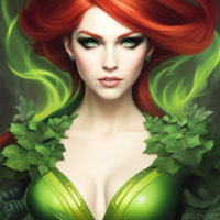 red hair and green accents, wearing what appears to be a costume inspired by the comic book version of Poison Ivy from the Batman series. The character is styled with makeup that enhances her eyes and lips, giving her a distinctive look that is often associated with her role as a villain in the DC