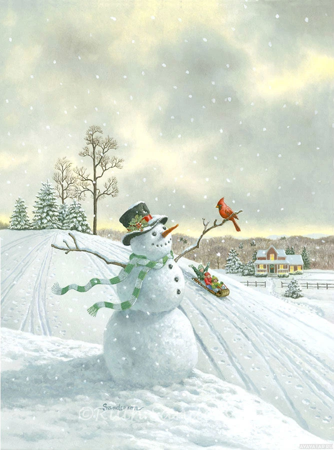 a clear sky with snowflakes falling gently, suggesting a light snowfall. Additionally, there are trees covered in snow, adding to the festive atmosphere of the scene. A red bird is perched on one of the tree branches in the distance, and a farmhouse can be seen nestled amongst the trees. The overall composition creates a warm and inviting winter setting.