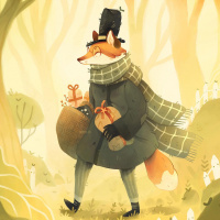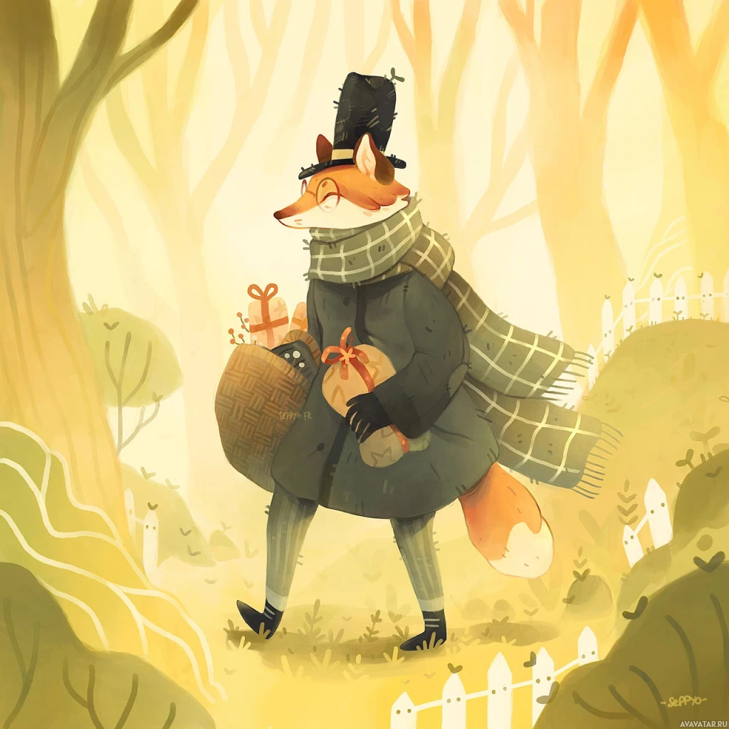 fox character dressed in human-like clothes, including a coat, hat, and scarf. The fox has been styled with
