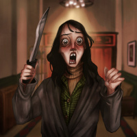 brunette hair and is holding a knife in her right hand. She has a distressed expression on her face with wide eyes and