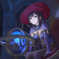 a large book open in front of her, suggesting a scholarly or magical activity. The artwork captures her with a whimsical expression, adding to
