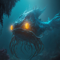 The picture depicts a fantasy-inspired scene featuring a large, mythical fish with glowing eyes. The fish is situated in an underwater environment with rocks and coral formations around it. The color palette of the image is dominated by blues and greens, contributing to an otherworldly atmosphere.