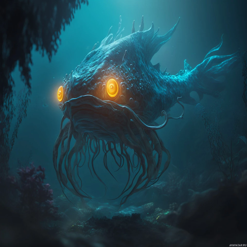 На картинке изображена сцена в стиле фэнтези с участием большой мифической рыбы со светящимися глазами. Рыба находится в подводной среде, окруженной скалами и коралловыми образованиями. В цветовой палитре изображения преобладают синие и зеленые тона, что создает атмосферу потустороннего мира.