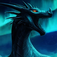 The image shows a fantastical creature that appears to be a dragon. It has a scaly, reptilian body and a large head with sharp teeth and eyes glowing red. The background is dark and features swirling clouds or possibly auroras, which suggests a magical or otherworldly setting typical of fantasy artwork.