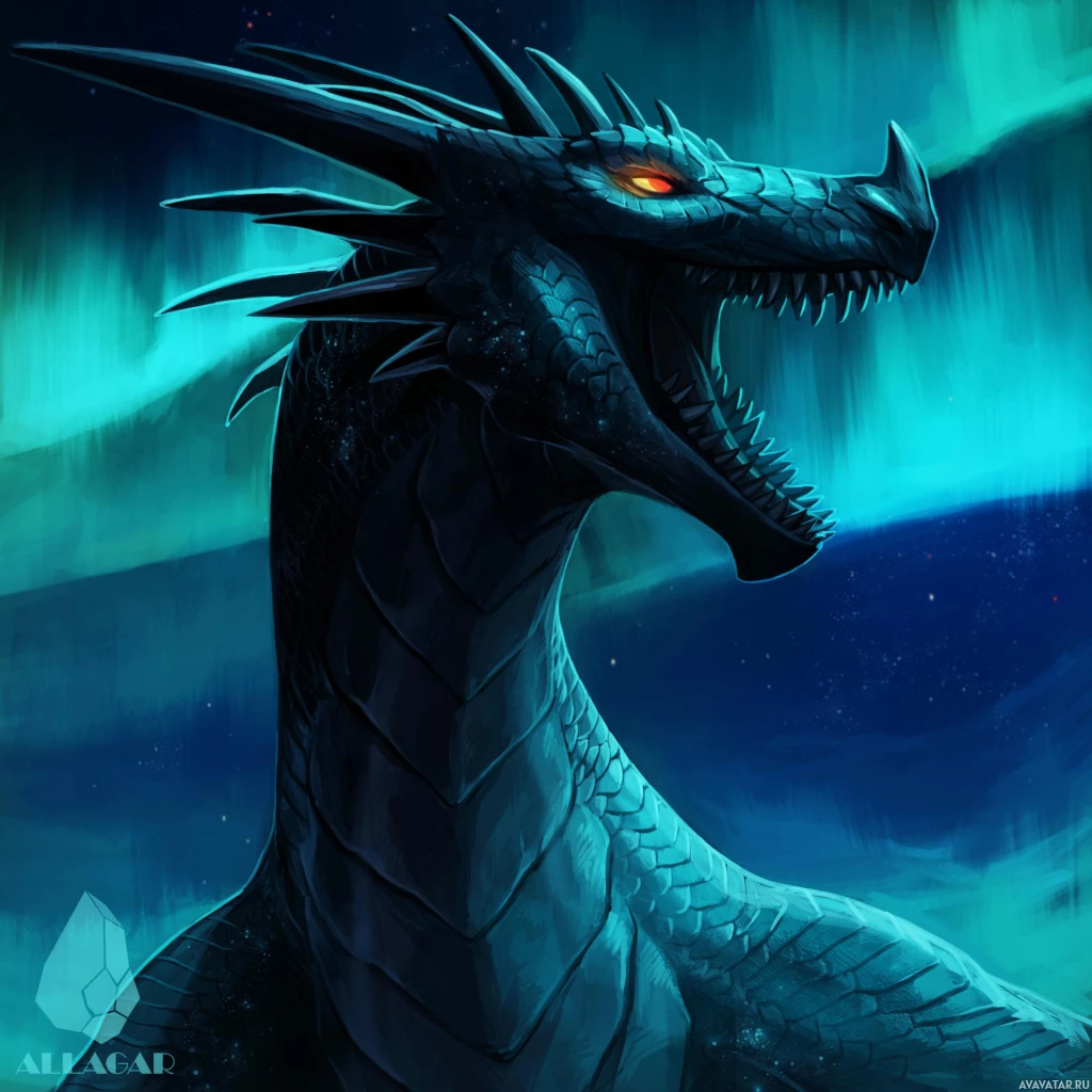 Картинка показывает фантастическое существо, которое кажется драконом. Он имеет чешуйчатое, рептильное тело и большую голову с острыми зубами и глазами, светящимися красным. Фон темный и имеет закрученные облака или, возможно, сияния, что предполагает магическую или потустороннюю обстановку, типичную для фэнтезийных произведений искусства.