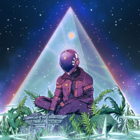 The image features an astronaut sitting at the base of a pyramid-shaped structure with