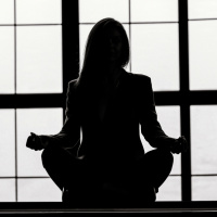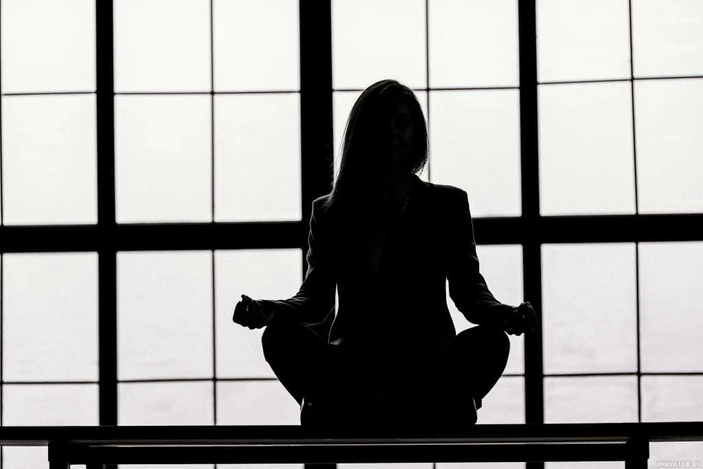 На картинке изображен силуэт человека, сидящего в позе лотоса, которая обычно ассоциируется с йогой или медитацией. Человек, по-видимому, медитирует или практикует позы йоги в помещении. Фон несколько размыт, но наводит на мысль о промышленной обстановке, возможно, офисном помещении из-за наличия чего-то похожего на перегородку или стену со стеклянными панелями, которые создают ощущение открытой среды.