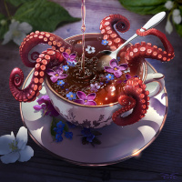 red eyes sitting in a teacup filled with what appears to be chocolate milk or hot cocoa. The octopus has several tentacles wrapped around the handle of the cup, suggesting