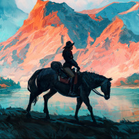 the back of a horse, silhouetted against a scenic mountain background during what appears to be either sunrise or sunset. The colors are warm and vibrant, with the sky transitioning from a cool