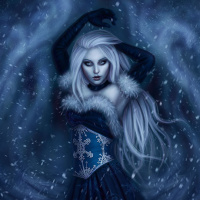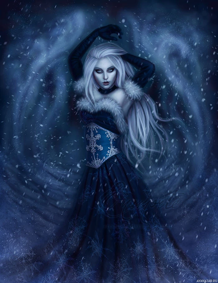 white hair and dressed in an elegant blue dress with fur trim around the neckline. She is standing amidst a whirl of snow or