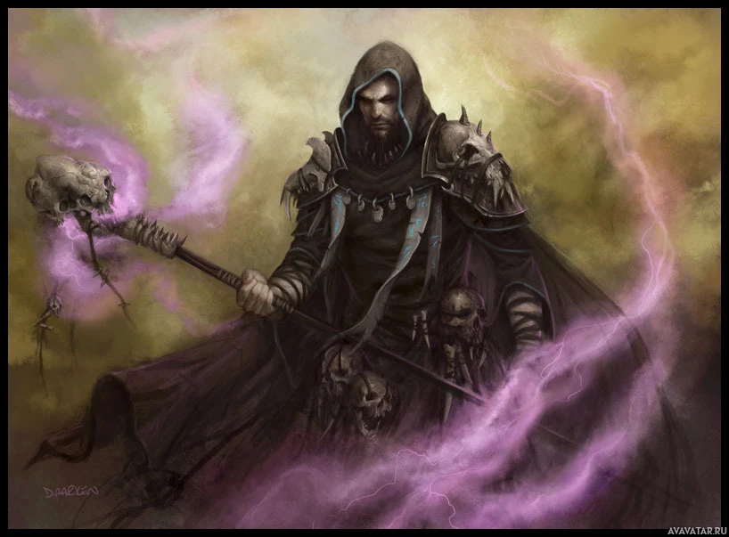 a fantasy character, commonly known as a mage or wizard in fantasy settings. This figure is wearing dark robes with hood and appears to be casting a spell with a staff in hand, surrounded by magical effects such as purple smoke and an ethereal,