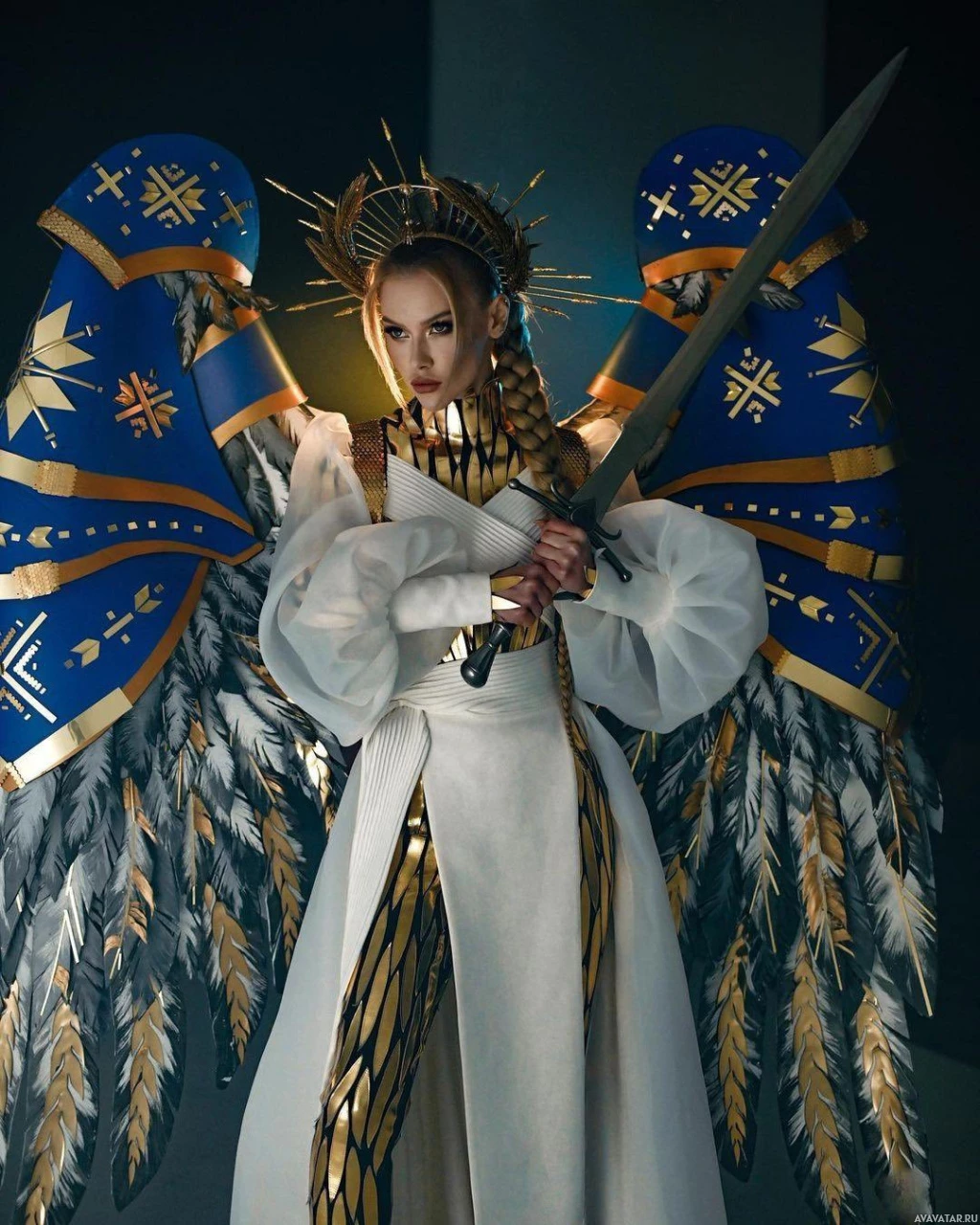 elaborate costume with angel-like wings and holding a sword. This individual is wearing what appears to be armor, suggesting they may be portraying an archetype such as an angel, warrior, or messenger from mythology or fantasy literature/media. The overall appearance is quite striking and likely designed for