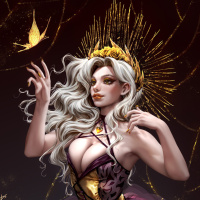 gold accents and what appears to be magical sparks or energy emanating from her hand, enhancing the mystical ambiance of the artwork.